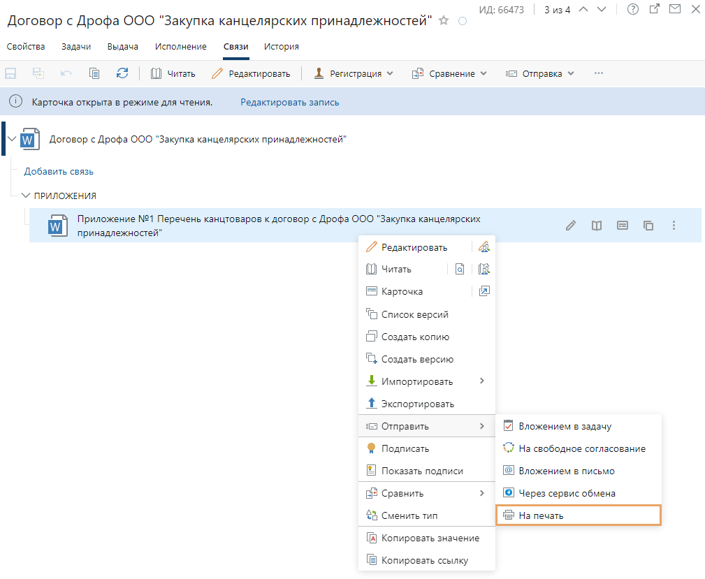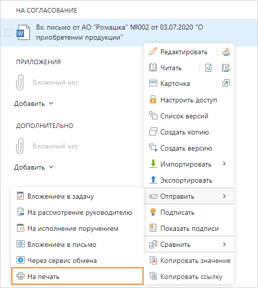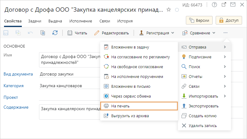 Иногда сотруднику нужно распечатать документ, который хранится в системе. Например, если помощнику подписывающего пришло задание на печать документа. Распечатать документы можно с помощью приложения-редактора или через действие