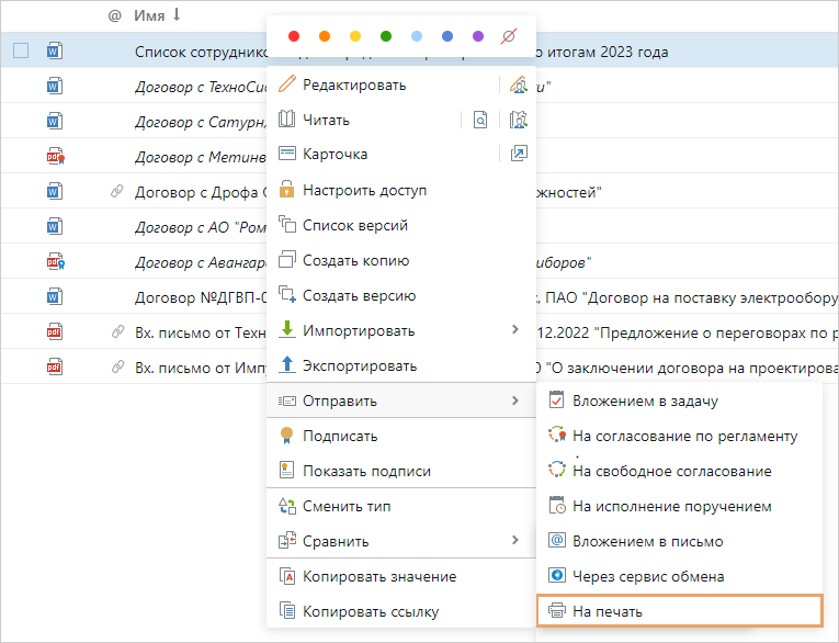 Чтобы отправить на печать несколько документов одновременно, выделите их в списке и в контекстном меню выберите На печать. Документы преобразуются в общий PDF-файл. Порядок выбора документов для печати не влияет на их расположение в общем документе: оно определяется на сервере.