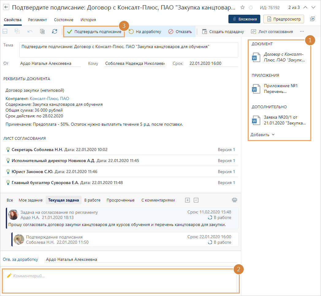 1.Откройте карточку задания на подтверждение подписания и ознакомьтесь с документом, приложениями и дополнительными документами из области вложений. Изучите инструкцию к заданию, если она есть.
