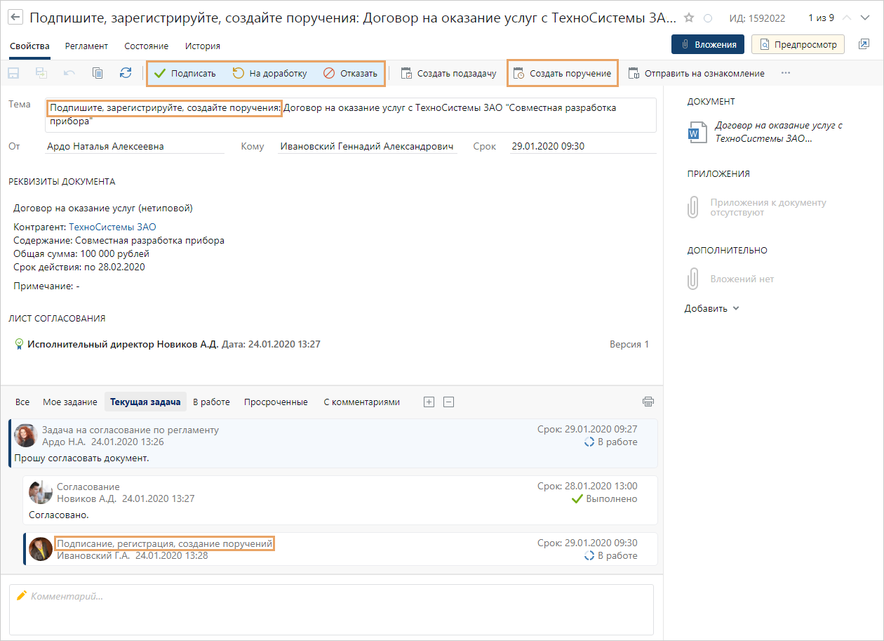 Важно. Выполняйте объединенное задание только после того, как сделали все, что указано в теме задания. Например, задание с темой «Подпишите, зарегистрируйте и создайте поручения» выполните только после подписания, регистрации и создания поручений. Для этого воспользуйтесь кнопками на панели действий, соответствующими каждому пункту задания.