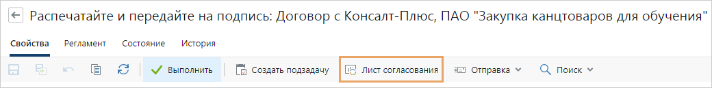 Чтобы сформировать отчет из карточки задания, на панели действий нажмите на кнопку Лист согласования: