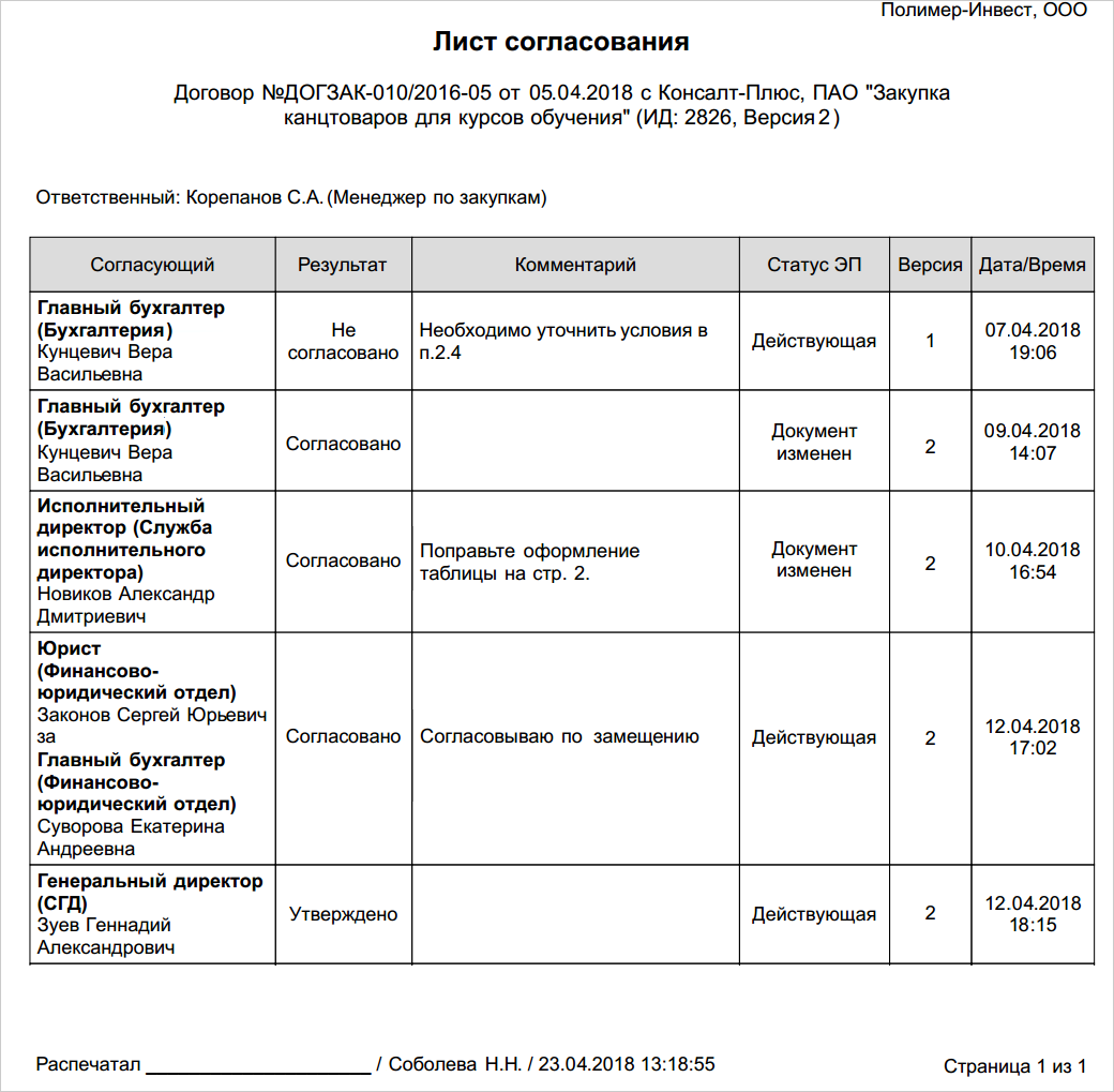 В отчете отображаются подписи документа с результатами «Согласовано» и «Утверждено». Для каждой подписи указывается: •должность, отдел и имя сотрудника, согласовавшего и подписавшего документ; •результат подписания; •комментарий, который оставил сотрудник при подписании документа электронной подписью (ЭП) вручную, либо при выполнении задания на согласование или подписание документа; ПРИМЕЧАНИЕ. При выполнении задания комментарий к ЭП заполняется из текста задания. Если сотрудник выполнил его и через некоторое время изменил текст задания, то в листе согласования комментарий остается исходным. Чтобы обновить комментарий, необходимо повторно подписать документ с новым комментарием и сформировать лист согласования. •статус электронной подписи. Возможные значения: Действующая. ЭП действующая, документ после подписания не менялся. Документ изменен. ЭП действующая, но текст версии документа изменился после подписания. Атрибуты подписи изменены, документ не изменен. У подписи изменены атрибуты, например, дата или сотрудник, который подписал документ. В этом случае сообщите администратору системы о том, что подпись недействительна. •номер подписанной версии документа; •дата и время подписания. Также в отчете отображается ответственный за документ. Ответственным считается сотрудник, который указан в карточке документа в поле Ответственный или *Подготовил. Если в карточке документа нет этих полей или не заполнены, то указывается сотрудник, который создал документ в системе. При этом, если документ создан системой, например, при поступлении из сервиса обмена, то ответственный в отчете не указывается. Если необходимо, чтобы в листе согласования отображалась вся информация о согласовании с учетом замечаний согласующих при отправке документа на доработку, то в персональных настройках установите флажок Показывать подписи с результатом «Не согласовано». Например, если вы формируете лист согласования для передачи руководителю и ему необходимо видеть разногласия, которые возникали при согласовании документа. Важно. Для корректного формирования листа согласования необходимо создавать новую версию документа на каждом круге согласования. |