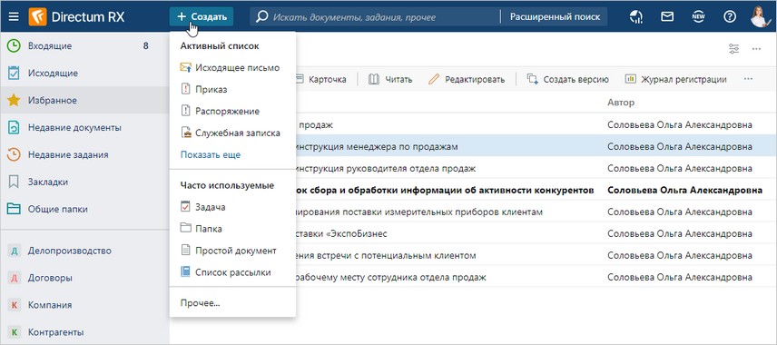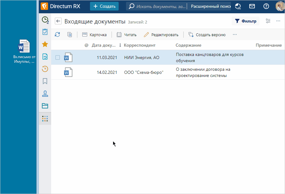 Создавать документы в системе можно автоматически с помощью интеллектуальных возможностей Directum RX. В этом случае документ заносится в систему, например с электронной почты, и его карточка заполняется данными без участия сотрудника.