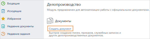 •на обложках модулей. Например, на обложке модуля «Делопроизводство» в группе «Документы» выберите пункт Создать документ: