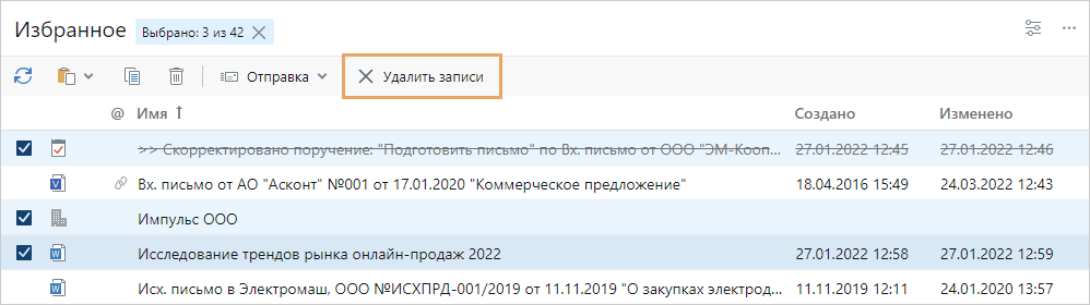 Чтобы удалить документы, выделите их в списке и на панели действий нажмите на кнопку Удалить записи. В открывшемся окне нажмите Да: