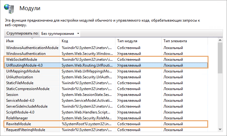 1.На веб-сервере Directum RX в диспетчере служб IIS откройте окно «Модули». Убедитесь, что в списке есть модули: