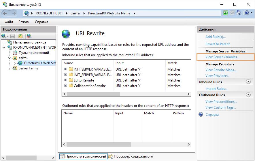 6.Добавьте правила для переопределения URL-адресов. Для этого откройте файл web.config. Путь по умолчанию – C:\inetpub\DirectumRX Web Site\web.config.