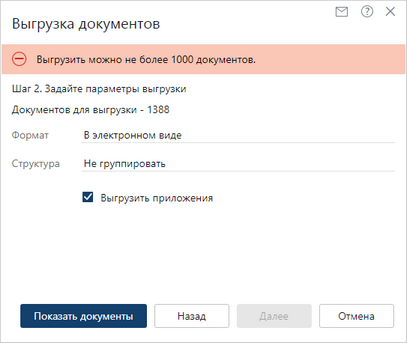 Иногда необходимо подготовить несколько тысяч финансово-хозяйственных документов по всем контрагентам. Например, для квартальной отчетности. Но количество выгружаемых документов не должно превышать 1000 за одну выгрузку, количество выгружаемых файлов не должно превышать 5000, а их общий размер – 450 Мб: