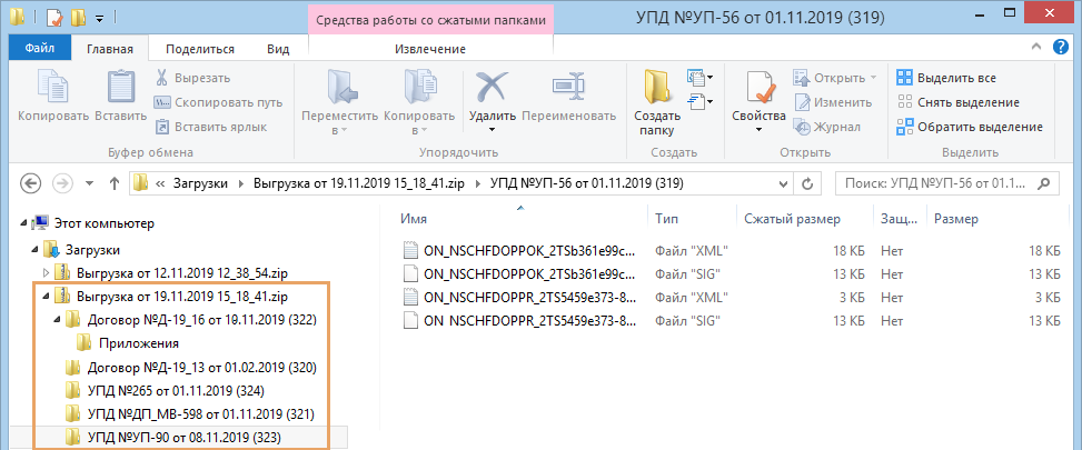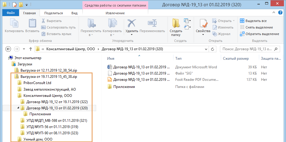 При выгрузке документов указаны параметры: В результате выгружается ZIP-архив, в котором для каждого выгруженного документа создается отдельная подпапка. Если у документа есть приложения, то они выгружаются в подпапку «Приложения»: Для документов внешнего ЭДО выгружается несколько файлов, подробнее см. таблицу. |