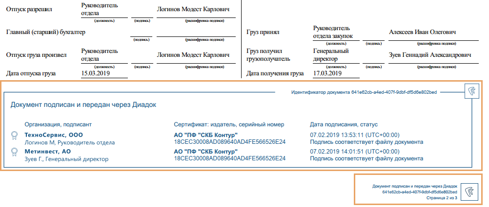 При выгрузке документов указаны параметры: В результате выгружается ZIP-архив, в котором создаются подпапки с названиями выгруженных типов документов. Выгруженные документы размещаются в соответствующих папках: При выгрузке для печати для приложений отдельная папка не создается, они размещаются в одной папке с основным документом. У всех выгруженных документов внешнего ЭДО есть отметка об ЭП нашей организации и контрагента, которая ставится системой автоматически. Также на каждой странице проставляется штамп с указанием идентификатора документа в сервисе обмена и номера страницы: Примечание. У некоторых документов внешнего ЭДО нет версии в формате PDF. Например, если документ защищен паролем. В этом случае выгружается файл с содержимым последней версии документа в формате, в котором она хранится в системе, без отметок об ЭП. |