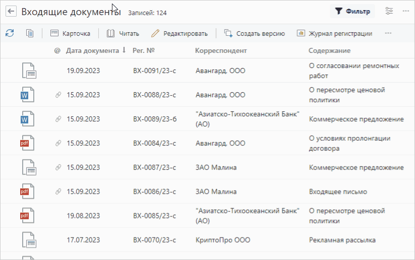 ПРИМЕЧАНИЕ. Если список отфильтрован, то при создании новой или изменении существующей записи она сразу отобразится в списке, несмотря на заданные условия фильтрации. После обновления списка запись исчезает, если она не удовлетворяет условиям фильтрации.