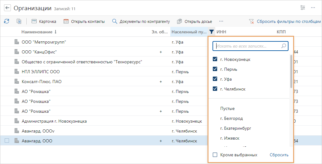 Списки можно фильтровать по значениям столбцов. Например, чтобы в списке отображались только те организации, которые находятся в выбранном населенном пункте.