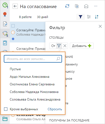 Для столбцов, в которых содержатся записи из других справочников (реже – списки документов, задач или других объектов), выберите значения любым из указанных выше способов. При этом по умолчанию в выпадающем списке столбца в качестве возможных значений отображаются значения, которые находятся в текущем столбце. Если в выпадающем списке значений больше 100, отображаются первые 100 значений. Остальные значения можно выбрать, воспользовавшись like-вводом в поле поиска. Выбранные значения для удобства и наглядности находятся сверху и отделены от остальных.