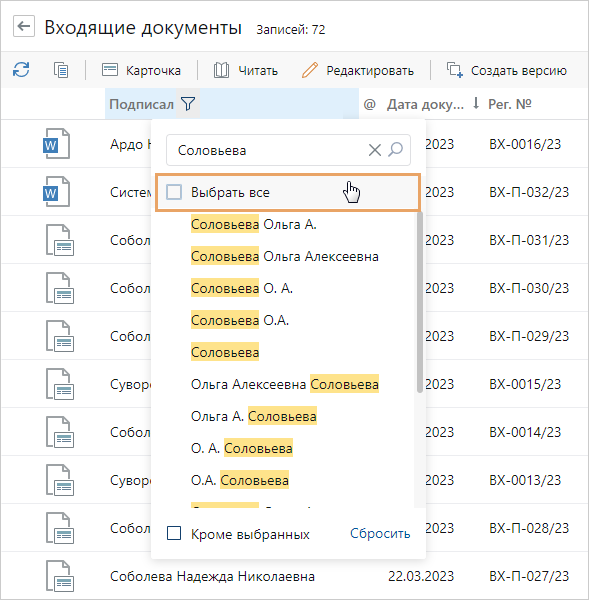 •поиск по фрагменту значения. Для столбцов, которые содержат строковую, текстовую или числовую информацию, в выпадающем списке возможные значения не отображаются. Например, для столбца Содержание или Рег. № документа. В этом случае в поле поиска введите фрагмент искомого текста.