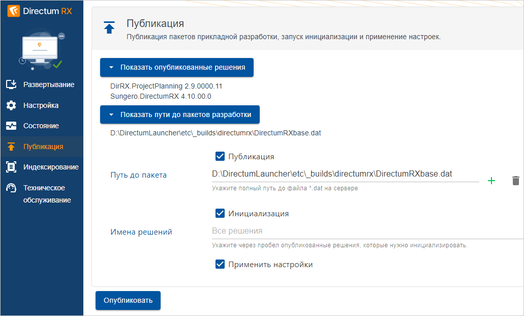 Для запуска публикации разработки используется инструмент Directum Launcher. Она выполняется на сервере Directum RX для публикации разработки в продуктивную систему, инициализации модулей и применения настроек бизнес-процессов по умолчанию. В этом случае публикацию рекомендуется выполнять в нерабочее время.