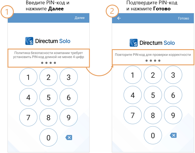 •requirePinSetup – требование использовать PIN-код для разблокировки клиентского приложения. Укажите значение true, если использование PIN-кода обязательно. После включения требования на устройстве пользователя отображается экран для ввода PIN-кода: