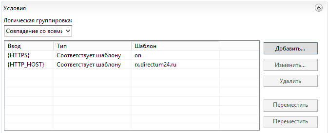 5.Аналогичным образом добавьте условие {HTTP_HOST} в правило для протокола HTTPS. Условие {HTTPS} создается по умолчанию. Настройки для протокола HTTPS должны иметь вид:
