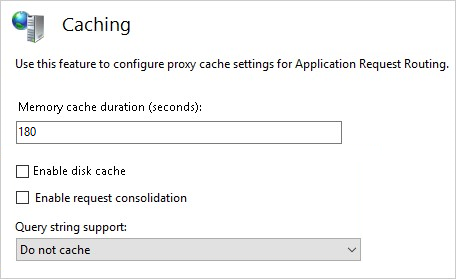 14.Убедитесь, что кэширование данных на диске отключено. Для этого в оснастке Диспетчер служб IIS нажмите на кнопку Caching. На открывшейся странице «Caching» убедитесь, что флажки Enable disk cache, Enable request consolidation сняты и в раскрывающемся списке Query string support выбран пункт Do not cache. В поле Memory cache duration (seconds) укажите значение 180: