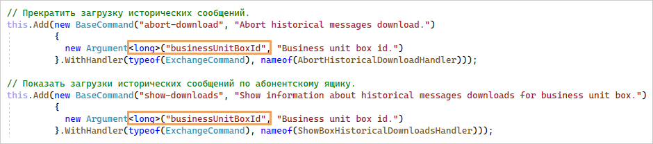 Если в вашей организации разработаны собственные плагины для утилиты RxCmd, то их нужно доработать вручную. Для методов, аргументов и переменных, которые обращаются к идентификаторам сущностей Directum RX, необходимо изменить тип с int на long. Например, изменить в плагине тип аргумента businessUnitBoxId – ИД абонентского ящика нашей организации: