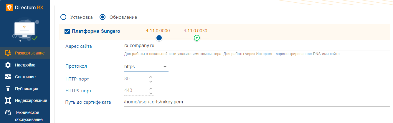 6.Убедитесь, что установлен флажок Платформа Sungero и заполнены настройки веб-сервера и сервисов.