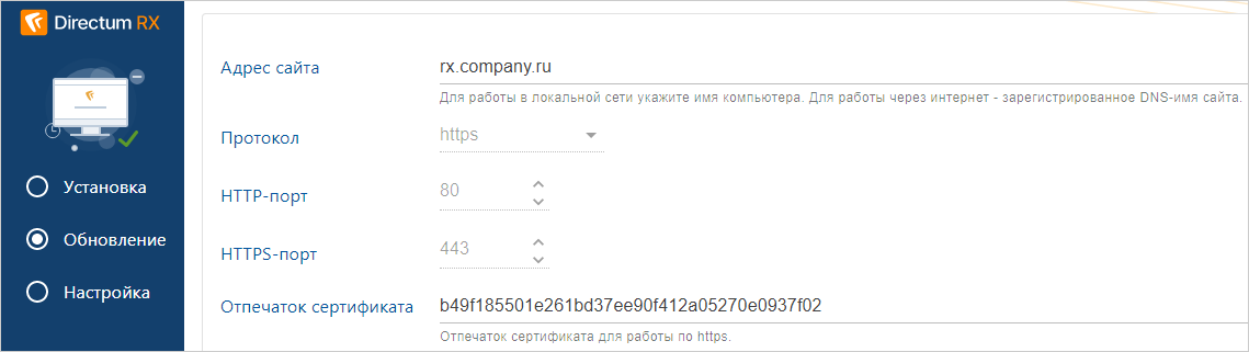 6.Проверьте, что поля заполнены верно. Подробнее см. инструкцию по установке сервера Directum RX.