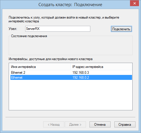 3.В окне «Создать кластер: Подключение» в поле Узел введите имя узла, который должен войти в новый кластер, и нажмите на кнопку Подключить: