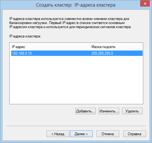 7.В окне «Создать кластер: IP-адрес кластера» укажите IP-адрес кластера, который будет использоваться всеми узлами в кластере, и нажмите на кнопку Далее: