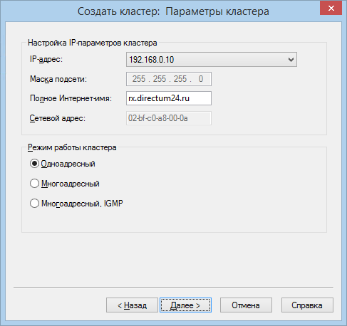 Режим работы кластера выбирайте исходя из настроек сети. Режим Многоадресный должен поддерживаться сетевым оборудованием. Например, может потребоваться дополнительная настройка коммутатора.