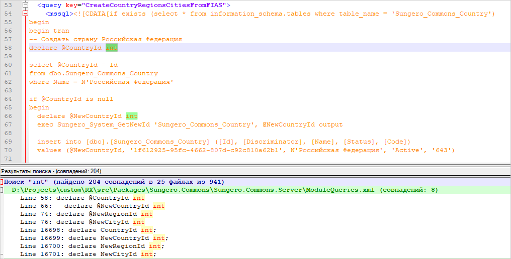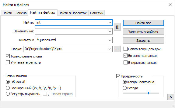 Чтобы быстро найти все места кода с идентификаторами сущностей, откройте текстовый редактор с поддержкой разных видов кодировок. Если вы работаете с Notepad++, то запустите поиск по исходным файлам решения с помощью горячих клавиш Ctrl+Shift+F и в открывшемся окне заполните поля: