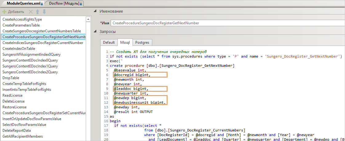 В модуле Docflow содержится SQL-скрипт, который получает очередные регистрационные номера документов. Скрипт создает хранимые процедуры (ХП). Аргументы некоторых ХП хранят ИД сущностей: @docregid – ИД журнала регистрации, @leaddoc – ИД ведущего документа, @newdep – ИД подразделения, @newbisunessunit – ИД нашей организации. Чтобы хранимые процедуры создавались корректно, для них тип int заменен на bigint: |