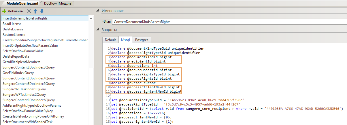 В модуле Docflow есть скрипт, который назначает права доступа на документы указанного вида. Скрипт содержит переменные, в которых хранятся ИД сущностей. Тип таких переменных также надо поменять с int на bigint: @documentKindId – ИД вида документа, @recipientId – ИД субъекта назначения прав (пользовать, группа, роль), @secureObjectId – ИД объекта, на который назначаются права, и другие: |