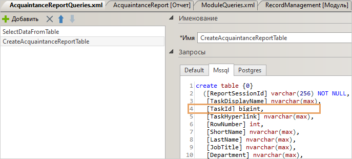 Скрипт CreateAcquaintanceReportTable создает временную таблицу, в которую записываются участники ознакомления с документом. В этой таблице есть колонка TaskId, содержащая ИД задач на ознакомление. Чтобы скрипт корректно получал данные об идентификаторах задач из базы данных, тип колонки изменен с int на bigint: |