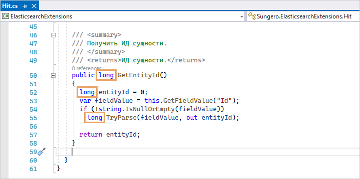 2.В файлах сторонней сборки измените тип int на long для найденных методов, их параметров и переменных. В примере тип обновлен для метода GetEntity() и его переменной entityId – ИД сущности. Также тип обновлен для метода TryParse(), который преобразует строковое значение в числовое, если ИД сущности не заполнено.