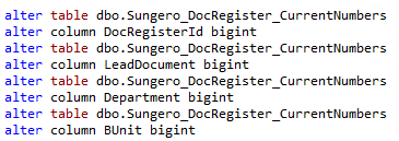 •если таблица создана в Microsoft SQL Server, то сначала в скрипте нужно удалить индексы и ограничения (constraints), изменить тип колонок на bigint, а затем добавить новые индексы и ограничения;