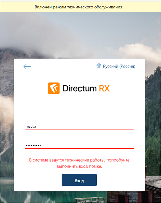 Функция включает режим технического обслуживания системы с показом сообщения для пользователя на странице аутентификации. Например, в тексте можно указать причину недоступности системы. Если сообщение не задано, то отображается текст по умолчанию: