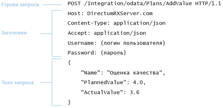Формат строки запроса: <Метод> <URL запроса> HTTP/1.1 Метод. Для обращения к функциям используются методы POST, GET и HEAD. Для обращения к типам сущностей: POST, GET, HEAD, PATCH и DELETE. Другие методы для обмена с Directum RX не используются. Если нужно проверить, существует ли функция или тип сущности, используйте HEAD-запрос. Он не возвращает данные, что позволяет уменьшить нагрузку на сервер. Пример запроса: HEAD /Integration/odata/IRoles HTTP/1.1 В ответе сервис интеграции возвращает код: 200 – функция или тип сущности существует, и 404 – не существует. URL запроса. Адрес до сервиса интеграции, запрашиваемой функции или репозитория типа сущности. Например, чтобы узнать, к каким функциям и репозиториям типов сущностей в Directum RX можно обратиться через сервис интеграции, используйте адрес в формате: {Протокол https или http}://{имя сервера, на котором установлен сервис интеграции}/{имя сервиса интеграции}/odata/$metadata
