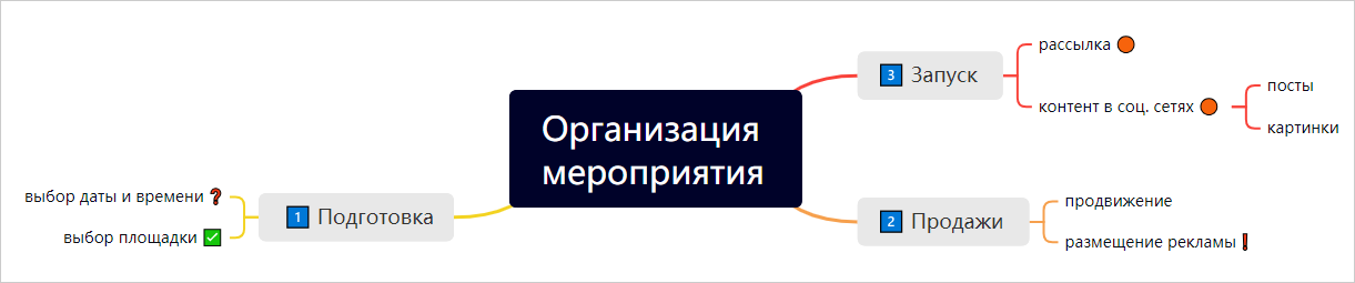 Чтобы дополнительно структурировать информацию, сгруппировать элементы карты или выделить ключевые идеи, добавьте в темы и подтемы маркеры:
