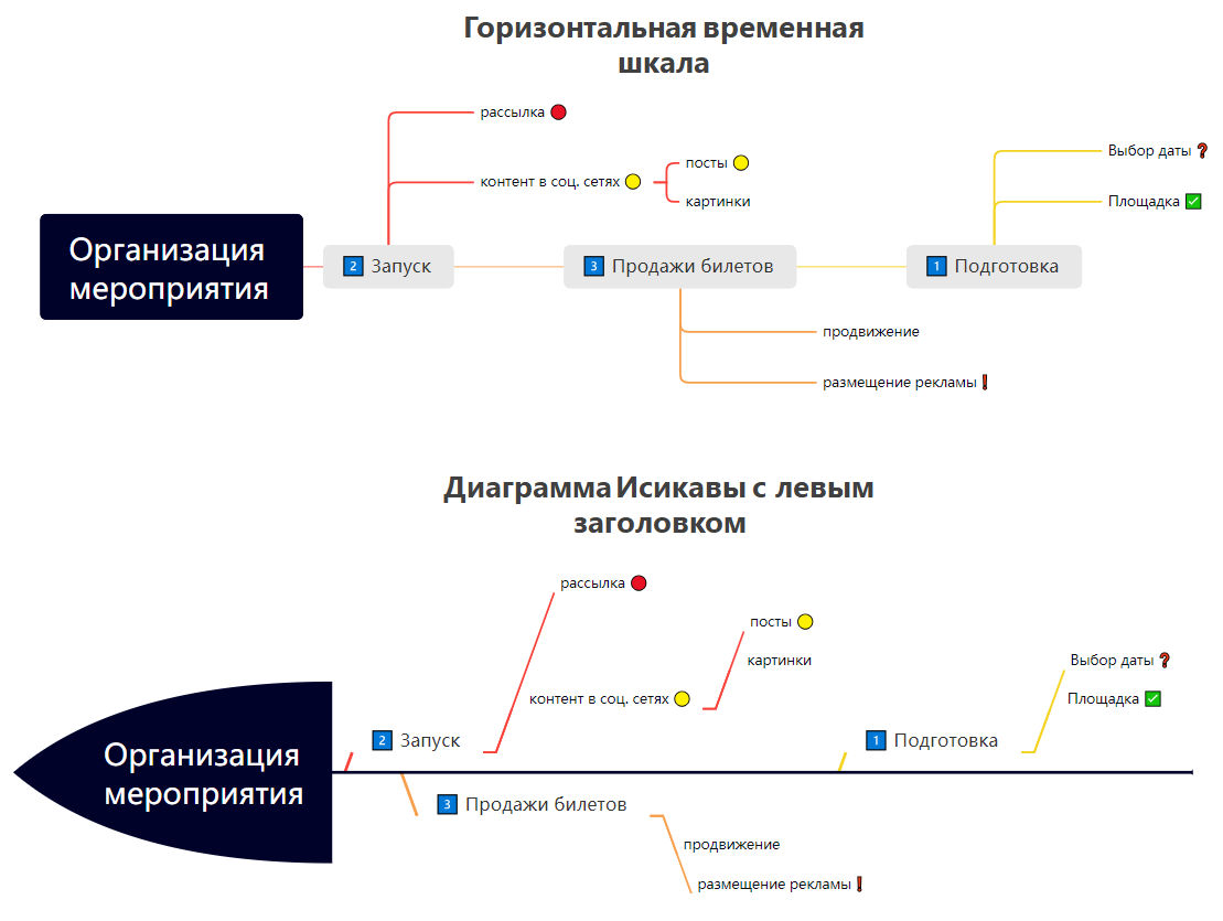 Например для создания причинно-следственных связей подойдет Диаграмма Исикавы, а если нужно отобразить события или действия в хронологическом порядке – Временная шкала: