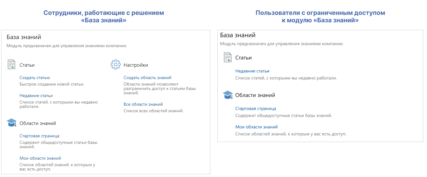 1.Добавьте сотрудников, которые будут создавать статьи и области знаний, в роль «Сотрудники, работающие с решением «База знаний». За участниками этой роли закрепляются персональные лицензии.