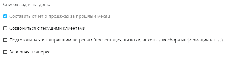 В дальнейшем выполненные пункты чек-листа можно отмечать флажками. После отметки пункт отображается зачеркнутым серым шрифтом.