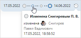 . В списке отображаются даты создания первой и последней версий. При наведении курсора на версию появляется информация об авторе, примечаниях к версии и дате изменения: