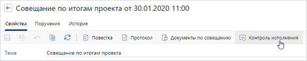 Чтобы сформировать отчет по конкретному совещанию, в карточке протокола данного совещания на панели действий в выпадающем списке Отчеты выберите пункт Контроль исполнения, либо в карточке совещания на панели действий нажмите на кнопку Контроль исполнения.