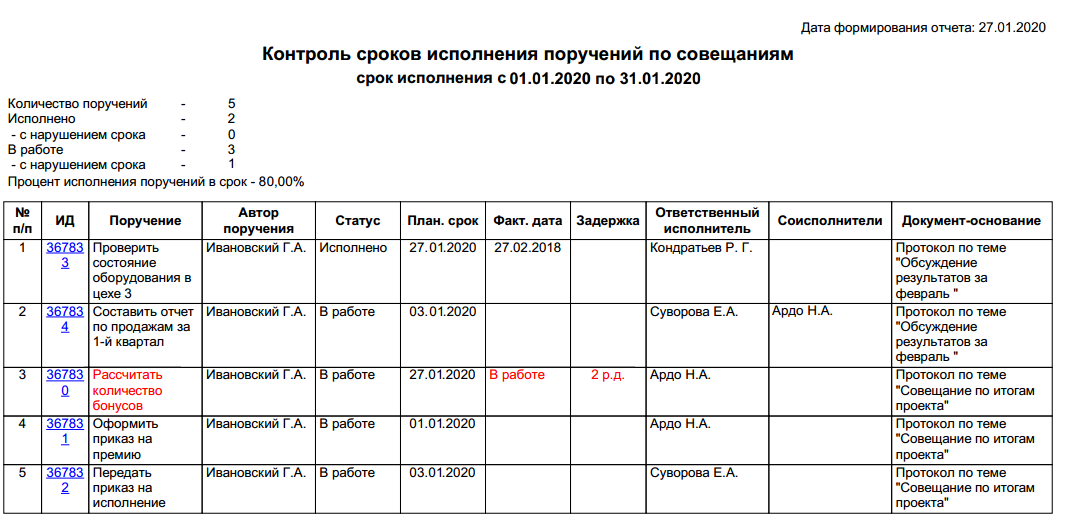 Если поручение выполнено меньше чем за 4 часа после завершения срока, то оно считается как исполненное в срок. Совет. Для получения подробной информации по поручениям сотрудников перейдите по ссылке в колонке ИД. |