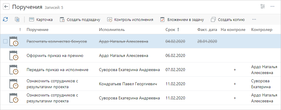 Откроется список поручений, у которых в группу вложений Документ для исполнения вложен протокол данного совещания.