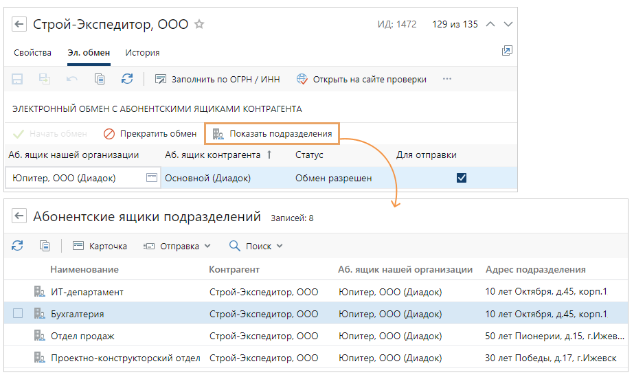 Для каждого подразделения контрагента, настроенного в сервисе обмена, автоматически создается абонентский ящик в справочнике Абонентские ящики подразделений контрагента. Записи справочника можно открыть только из карточки организации или филиала.