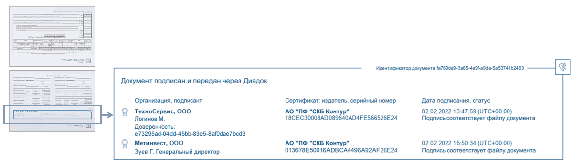 ПРИМЕЧАНИЕ. Если документ подписан на основании электронной доверенности, то в отметке об ЭП отображается единый регистрационный номер доверенности. Для документов, подписанных в филиале, в отметку об электронной подписи подставляется название филиала контрагента, а не головной организации.