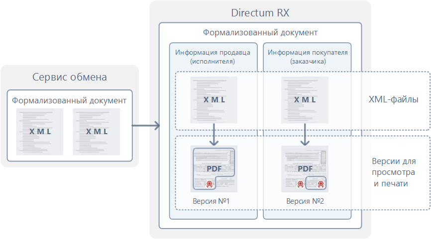 Чтобы сотрудники могли просматривать и распечатывать формализованные документы, в Directum RX на основе XML-файлов с информацией продавца (исполнителя) или информацией покупателя (заказчика) автоматически формируются версии документов в формате PDF.