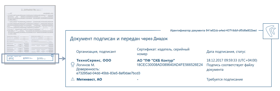 Примечание. Для документов, подписанных в филиале, в отметку об электронной подписи подставляется название филиала контрагента, а не головной организации.