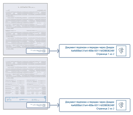 Также на каждую страницу документа в формате PDF добавляются штампы с указанием идентификатора документа в сервисе обмена и номера страницы: