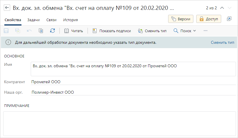 Документы, полученные от контрагентов или отправленные нашей организацией из сервисов обмена, изначально в Directum RX имеют тип «Входящий документ эл. обмена». Для них в системе: